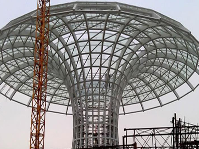 二、球形网架结构因其结构新颖,受力合理,自重轻、用钢量低等优点。如大型体育场馆球形朝阳螺栓球网架、公共场馆球形网架、电厂朝阳螺栓球网架、水泥工业球形网架、仓储物流球形网架、朝阳干煤棚工业球形网架、朝阳收费站朝阳加油站球形网架、展览中心、影剧院、商场、航站楼、候车厅、工厂朝阳车间、仓库、电视塔等球形螺栓球节点网架。国内球形网架结构主要分为:朝阳焊接球节点网架及螺栓球节点网架两种。螺栓球节点网架其构件工厂内加工量较大,现场安装便捷,适用于现场工期紧,朝阳施工条件、用电量受制约,网架形状复杂、朝阳杆件定位困难的异形结构。螺栓球节点球形网架系统基本由朝阳杆件、螺栓球、支撑支座等组成。按照节点形式可分为交叉朝阳桁架体系、四角锥体系、三角锥体系等。支撑方式多为固定支座支撑。对于大面积、大跨度及有特殊受力或伸缩要求的网架结构可采用橡胶支座、滑移支座、球铰支座等支撑形式,以满足结构自身的受力稳定、均衡,便于内力释放等设计要求。